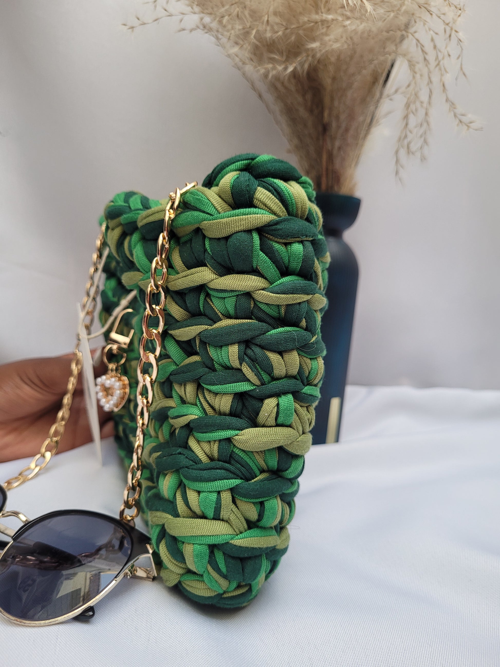 Sac crocheté à la main avec soin, en fil recyclé type "laine T-shirt" de haute qualité, sélectionné pour sa douceur, sa résistance et son rendu structuré.